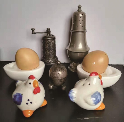 两只老母鸡的后面是两枚鸡蛋,虽然也是瓷器的,但是其颜色和大小几乎和真鸡蛋一模一样,惟妙惟肖,令人赞叹不已。同样,其中一只蛋上有两个小洞,另一只蛋上有三个小洞;一只是胡椒粉瓶,一只是盐瓶。不知道它们是哪个国家出品的,也忘了花多少钱买来的,只知道它们不是新货,有些年头了。