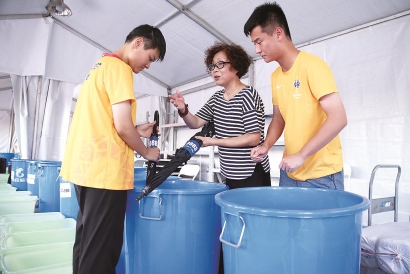 许恋辉(中)在指导志愿者记者李铭珅摄