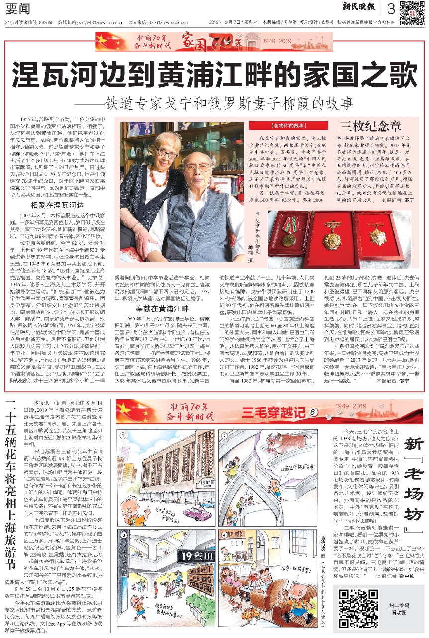 1955年,苏联列宁格勒。一位英俊的中国小伙和美丽的俄罗斯姑娘相识、相爱了。从涅瓦河边到黄浦江畔,他们携手走过64年风风雨雨。如今,两位耄耋老人依然相伴相守,相濡以沫。这是铁道专家戈宁和妻子柳霞(柳德米拉·巴巴斯基娜)。他们在上海生活了半个多世纪,用自己的方式为这座城市奉献着,也见证了它的日新月异。再过些天,是新中国成立70周年纪念日,也是中俄建交70周年纪念日,对于这个跨国家庭来说意义非同寻常。因为他们的命运一直和中华人民共和国,和上海紧紧连在一起。