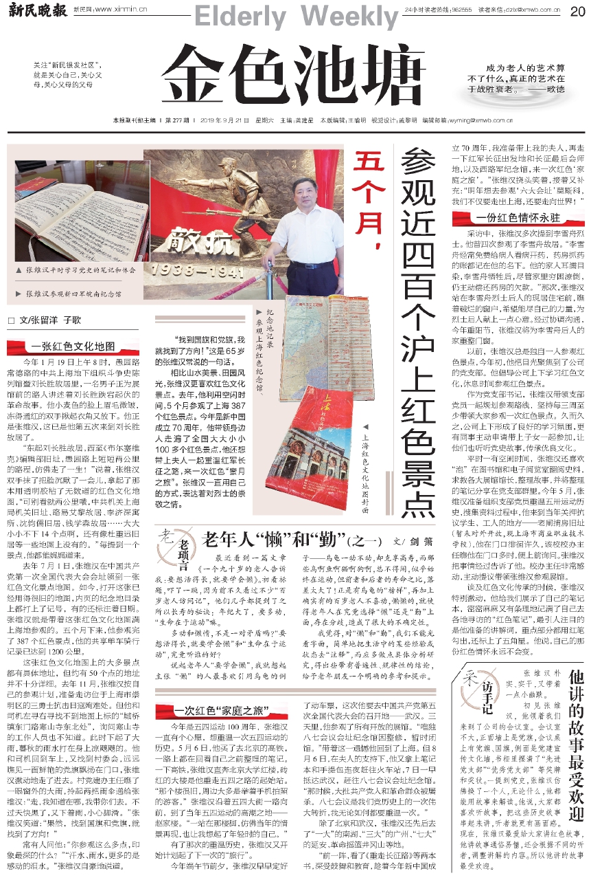 “前一阵,看了《重走长征路》等两本书,深受鼓舞和教育,趁着今年新中国成立70周年,我准备带上我的夫人,再走一下红军长征出发地和长征最后会师地,以及西路军纪念馆,来一次红色‘家庭之旅’。”张维汉挠头笑着,接着又补充:“明年想去参观‘六大会址’莫斯科,我们不仅要走出上海,还要走向世界!”