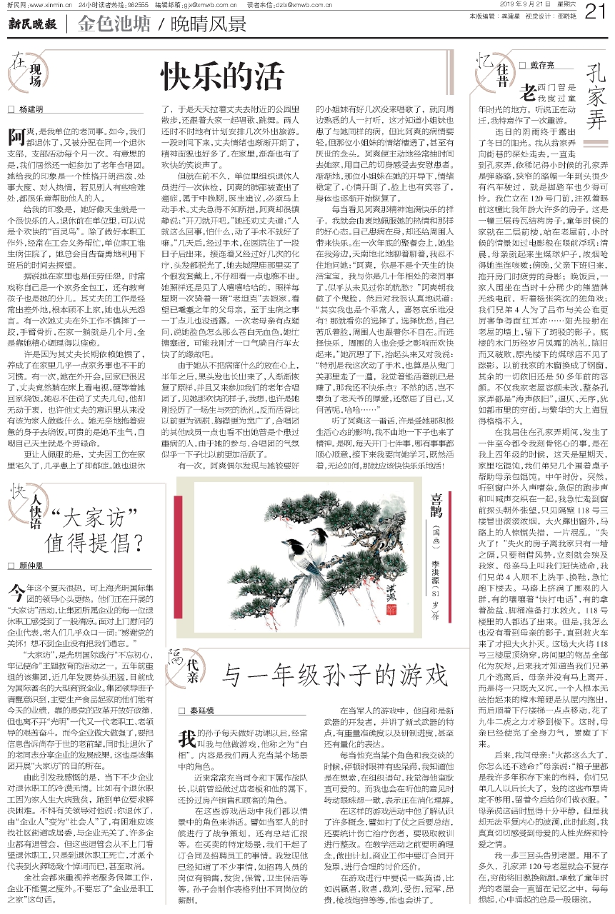 给我的印象是,她好像天生就是一个很快乐的人。退休前在单位里,可以说是个欢快的“百灵鸟”。除了做好本职工作外,经常在工会义务帮忙,单位职工谁生病住院了,她总会自告奋勇地利用下班后的时间去探望。