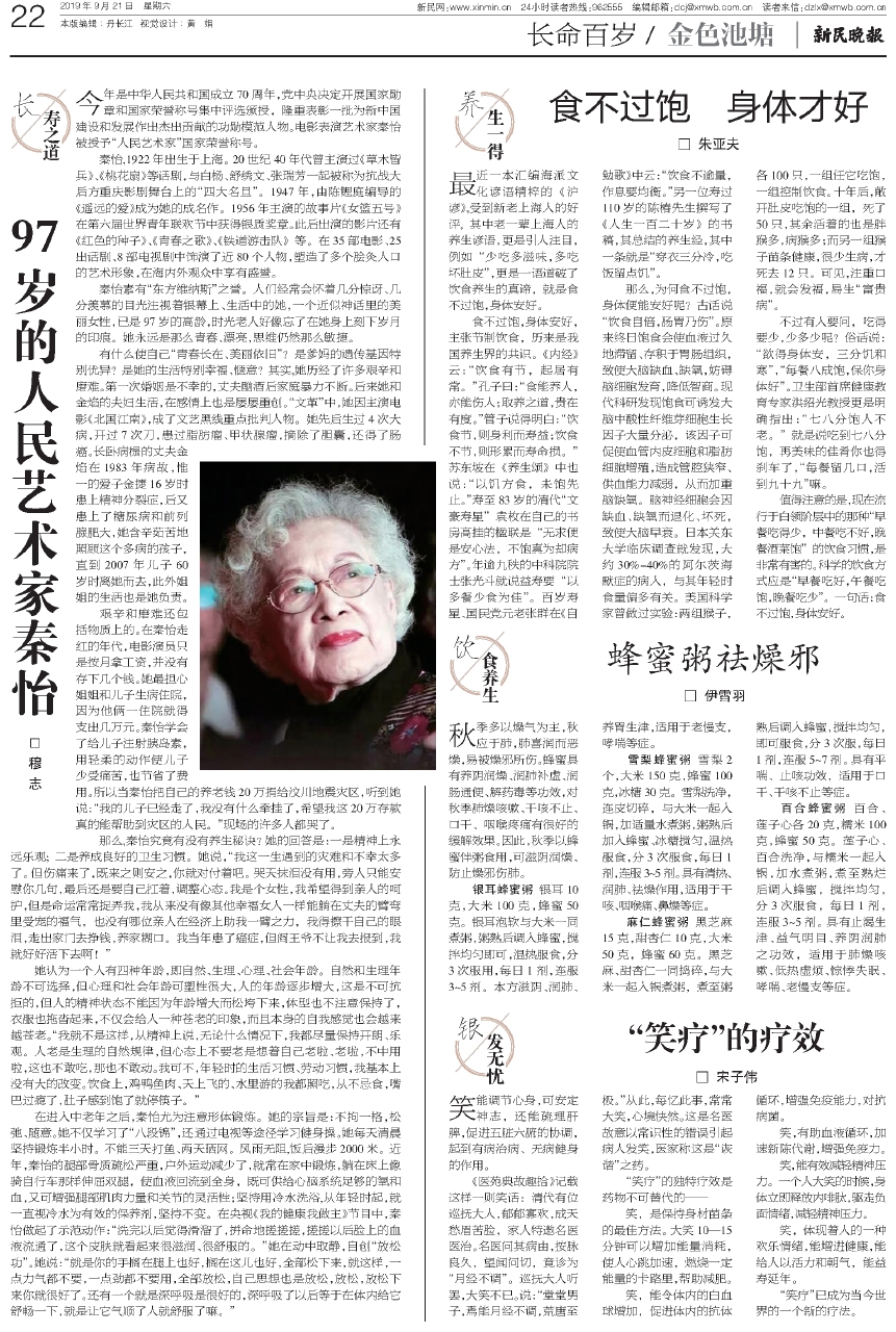 那么,秦怡究竟有没有养生秘诀?她的回答是:一是精神上永远乐观;二是养成良好的卫生习惯。她说,“我这一生遇到的灾难和不幸太多了。但伤痛来了,既来之则安之,你就对付着吧。哭天抹泪没有用,旁人只能安慰你几句,最后还是要自己扛着,调整心态。我是个女性,我希望得到亲人的呵护,但是命运常常捉弄我,我从来没有像其他幸福女人一样能躺在丈夫的臂弯里受宠的福气,也没有哪位亲人在经济上助我一臂之力,我得擦干自己的眼泪,走出家门去挣钱,养家糊口。我当年患了癌症,但阎王爷不让我去报到,我就好好活下去啊!”