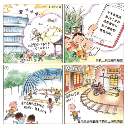 这时候手机铃声大作,手机短信显示,今天是我国第19个全民国防教育日,也是上海人民防空警报试鸣日。三毛这才恍然大悟,回头一看,身边的行人虽然都加快了脚步,但丝毫没有慌乱的样子。