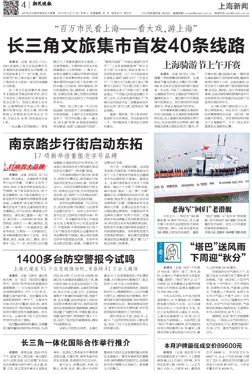 同时,长三角三省一市文化和旅游部门纷纷发布了各地最新的文化旅游线路:上海市文化和旅游局发布了“百万市民看上海——看大戏,游上海”秋季40条旅游线路及相关解读,包括“上海旅游节活动”、“建筑可阅读”、“中国上海国际艺术节”、“工业旅游线路推荐”“秋日文艺之旅”五大板块,串起上海16个区的特色资源,让广大市民游客充分感受上海的“海派文化”、“红色文化”、“江南文化”品牌;浙江省以“跟着诗人游浙江”为主题,向长三角市民游客推出浙江“诗路之旅”;安徽省推出“不可错过的秋游安徽打卡地”;此外,江苏省无锡市推出了“无锡大运河旅游产品”,安徽省安庆市推出五条“读问三源,独秀安庆”精品线路。