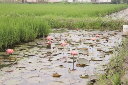 田里是绿油油的水稻,四周沟渠是娇艳欲滴的睡莲,田埂上布满着艾草、枸杞、马兰头……这里是松江区新浜镇文华村打造的“稻莲共生立体农业”的一景。