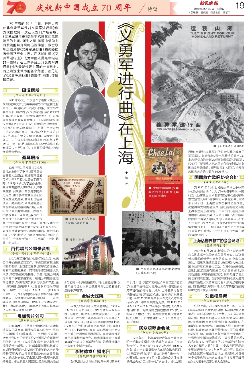 70年前的10月1日,开国大典在北京隆重举行,《义勇军进行曲》作为代国歌第一次在天安门广场奏响。《义勇军进行曲》诞生于抗日救亡氛围浓重的上海。诞生之初,该歌曲借助上海发达的媒介网络迅速传播,救亡歌咏运动又将《义勇军进行曲》的传播推向全国乃至全世界。在抗战时期,《义勇军进行曲》成为中国人民最常唱起的一首歌;在世界舞台上,《义勇军进行曲》成为最能代表中国的一首歌曲。而上海这座城市的各个角落,都见证了《义勇军进行曲》的创作、录制、传播和荣光。