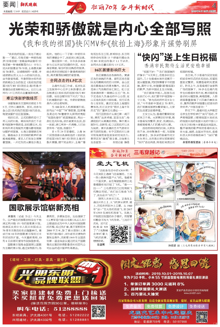 自4月29日首播起,上海16个区陆续推出各具特色的《我和我的祖国》快闪MV和《航拍上海》形象片展播。据不完全统计,上海广播电视台东方卫视、新闻综合、东方明珠移动电视等13个频道共播出快闪MV和航拍形象片1.1万余次,全网点击总量达到约1.5亿次。