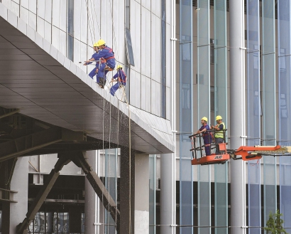 清洗国家会展中心外立面迎盛会 记者 陈梦泽 摄