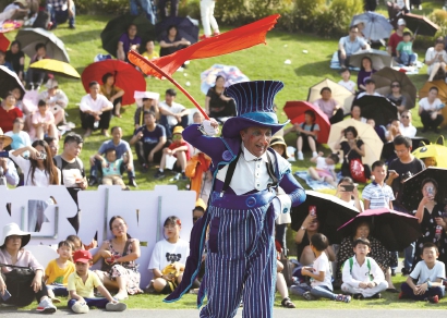 在位于金山朱泾的花开海上生态园,游客除了赏花观景,还可欣赏来自俄罗斯的马戏表演特约通讯员庄毅摄