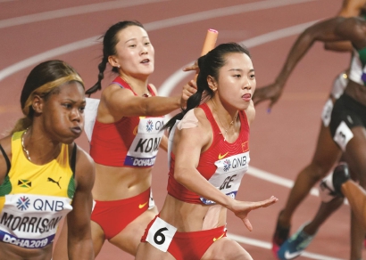 发令枪响,梁小静第一棒就争到第四的位置,二棒韦永丽更是超越意大利队来到第三,孔令微接过大姐的接力棒,扎实地起步、加速,信心十足,交到葛曼棋手里时,保持着中国队的第三位置,最终,中国队以42秒36排在牙买加队和英国队后,以总排名第三的高位进入决赛。