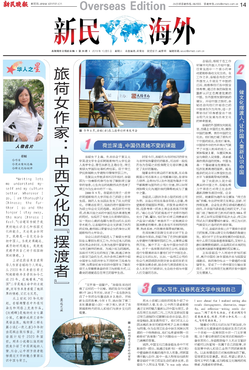 除了向欧洲人民介绍真实的中国之外,岳韬也致力于将自己对荷兰社会的最新洞察传递回中国。业余时间,她兼职为海外华文媒体“荷兰在线”供稿,专注研究荷兰在商业、创新、可持续发展、企业社会责任领域的最前沿动向。许多国内读者通过她的文字,不出国门就了解到荷兰新兴的绿色MBA项目、荷兰如何实现循环经济大业、荷兰如何试点开展智慧城市建设、荷兰为对抗气候变化打造的奶牛厕所等。