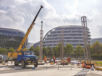 为了达到这一效果,国庆期间先要做好铺设。“趁着假期里没有大型展会,交通状况也更好,我们要抓紧把各种物料运进来,然后搭建好框架,铺上泥土。硬件越早完工,后续工作才从容。”周凌鹏告诉记者,和去年摆上一盆盆花草不同,今年植物都直接种在土里,工作量更大,因此这几天他们忙着搭建钢结构、木围边,运土铺土。