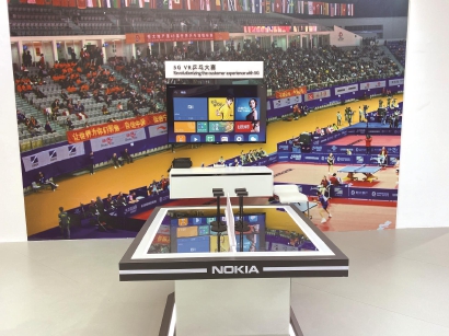 一张小方桌当中放一块隔板,有点像乒乓球台,却又让人“无从下手”,而且,现场也不提供乒乓球。事实上,这是诺基亚设置的一款虚拟乒乓球游戏,不需要球和球台,观展者只要戴上VR(虚拟现实)眼镜,就能马上身临其境地进入角色。你可以选择独自与虚拟对手过招,也可以邀上同伴,两人同时沉浸到VR的世界里,畅快淋漓地大战三百回合。