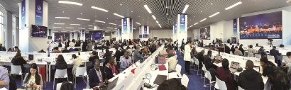 在新闻中心二楼文化展演展示区,上海音乐厅精心打造的“音乐午茶”为记者们送上精美贺卡,并请记者们现场体验乐器演奏,感受音乐魅力。由上海市文化和旅游局打造的非遗客厅,为记者准备了盘扣、进博会四叶草香囊、上海剪纸明信片等非遗礼品。充满浓浓书香的朵云书房,也为大家送上了包括诺贝尔文学奖得主作品在内的书籍等特色礼物。图为数千名中外记者在进博会新闻中心忙碌工作