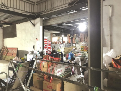 底楼有家粮油副食品批发店,纸板箱堆积如山,食用油、酱油、调味料等几乎堆到了天花板。店内的灭火器被放在很远的角落里,覆着厚厚的一层灰。