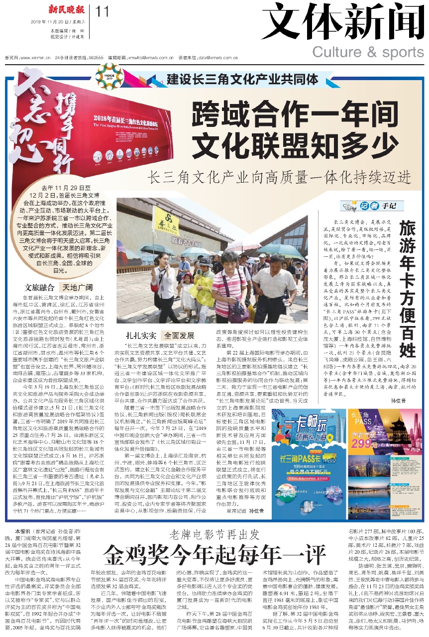今年3月19日,上海及长三角地区公共文化和旅游产品与服务采购大会成功举办,公共文化产品与服务长三角区域化供给模式逐步建立;5月21日,《长三角文化和旅游高质量发展战略合作框架协议》签署,三省一市明确了2019年共同推进长三角地区文化和旅游高质量发展战略合作的25项重点任务;7月26日,由浦东新区文化艺术指导中心、马鞍山市文化馆等18个长三角地区文化馆共同发起的长三角城市文化馆联盟正式成立;8月16日,沪苏浙皖“跟着考古去旅游”精品线路从上海松江区广富林文化遗址“出发”,线路行程包含有长三角三省一市重要的考古遗址(见右上图);9月21日,在上海旅游节长三角文化旅游集市开幕式上,“长三角PASS”旅游年卡正式发布,首批推出“沪杭宁版”、“沪杭版”多款产品。游客可以按需购买年卡,畅游沪宁杭71个热门景点,方便实惠……