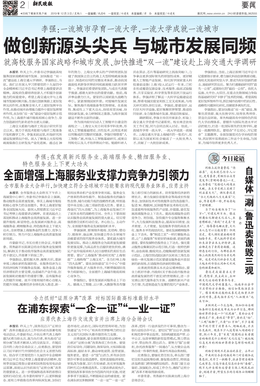 本报讯 昨天上午,市委书记李强就高校服务国家战略和城市发展、加快推进“双一流”建设赴上海交通大学调研。李强指出,当前,我们正在深入学习贯彻党的十九届四中全会精神和习近平总书记考察上海重要讲话精神,高校肩负着培养创新人才和提升创新能力的双重使命,希望上海交通大学与上海城市发展同频共振,在强化创新策源上更好发挥尖兵作用,在集聚全球人才上更好发挥平台作用,在推动城市治理能力提升中更好发挥智库作用,在加快“双一流”建设中更好发挥示范作用,为上海提升城市能级和核心竞争力、奋力创造新时代新奇迹作出更大贡献。