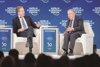 联合国秘书长古特雷斯(右)在达沃斯论坛发言