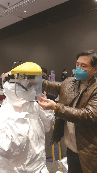 赵波(右)指导医护人员正确穿戴防护服