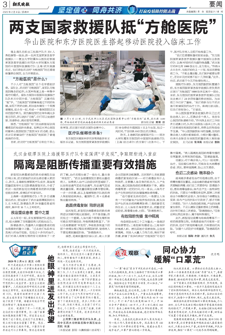 继上海先后派出三批医疗队共334人奔赴援鄂一线后,新一批两支国家紧急医学救援队——复旦大学附属华山医院赴鄂国家紧急医学救援队和同济大学附属东方医院的中国国际救援医疗队(上海)前天驰援武汉。他们将在武汉的“方舱医院”附近搭建帐篷移动医院,全力开展救治。