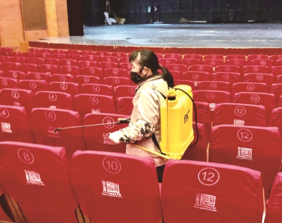 根据票务中心、办公室、演职人员通道、车库等不同位置的空间特点,每日对各区域进行2-3次有针对性的清洁消毒。各电梯和出入口采取每3小时1次的高频消毒,就连对外广场各保安岗亭、各垃圾桶也不放过。