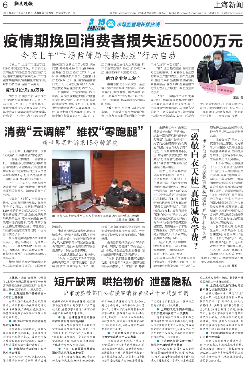 今天上午,上海市市场监管局、12345市民服务热线、新民晚报社共同发起“市场监管局长接热线”行动。在率先接通市民来电后,市市场监管局副局长胡浩接受本报专访,解析消费热点,回应市民关切。