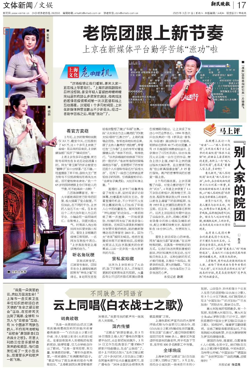 “这场疫情让我们看到,原来大家一直在线上等着我们。”上海京剧院副院长吕祥没想到,备受年轻人喜爱的哔哩哔哩网站居然有那么多资深京剧迷,传统戏迷的画像在疫情期间被一次次直播和线上互动颠覆。这短短1个多月时间里,上京在新媒体阵营里翻出不少新花头,经过一番勤学苦练之后,明显“涨功”了。