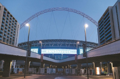 英国伦敦温布利球场9日晚亮灯向医护人员致敬本版图片GJ