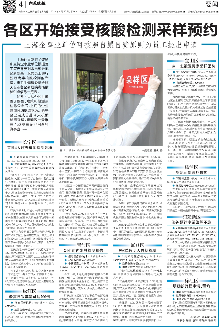 公司人力资源相关负责人告诉记者,上海市和长宁区出台相关政策后,昨天上午8时便致电同仁医院预约,医院接报后安排在当天下午4时进行检测采样,建议4名员工做好防护措施一同前往。