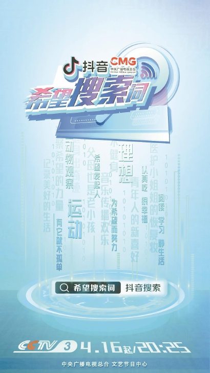 “你是爱,是暖,是希望,你是人间的四月天。”历经近4个月的坚守,2020年迎来了四月的春暖花开。大家有一种心绪却别无二致——对未来的憧憬和希望。近日,中央广播电视总台文艺节目中心联合抖音制作的融媒体云综《希望搜索词》在抖音平台上线多支短视频,一时引发热烈讨论,“希望搜索词”相关话题视频播放量迅速突破三千万。成龙、佟丽娅、沈腾、易烊千玺、蒋欣、任鲁豫、朱广权……数十位演艺界人士、主持人纷纷现身号召观众参与节目互动,共同汇聚希望的光,照亮生活的美。该节目将于今天20:25在央视综艺频道播出。