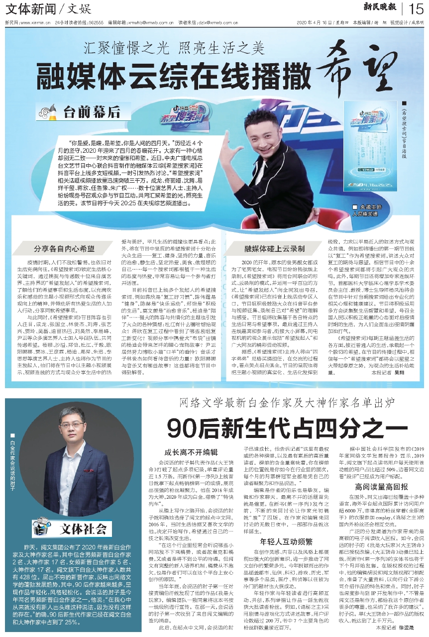 昨天,阅文集团公布了2020年最新白金作家及大神作家名单,其中包含男频新晋白金作家2名、大神作家17名,女频新晋白金作家5名、大神作家17名。阅文旗下白金大神作家人数共有428位。层出不穷的新晋作家,反映出网络文学的蓬勃发展趋势,其中,90后作家越来越多,呈现作品年轻化,风格轻松化。会说话的肘子是今年两名男频新晋白金作家之一,他说:“在我心中从来就没有新人出头难这种说法,因为没有这样的存在。”的确,90后新生代作家已经在阅文白金和大神作家中占到了25%。