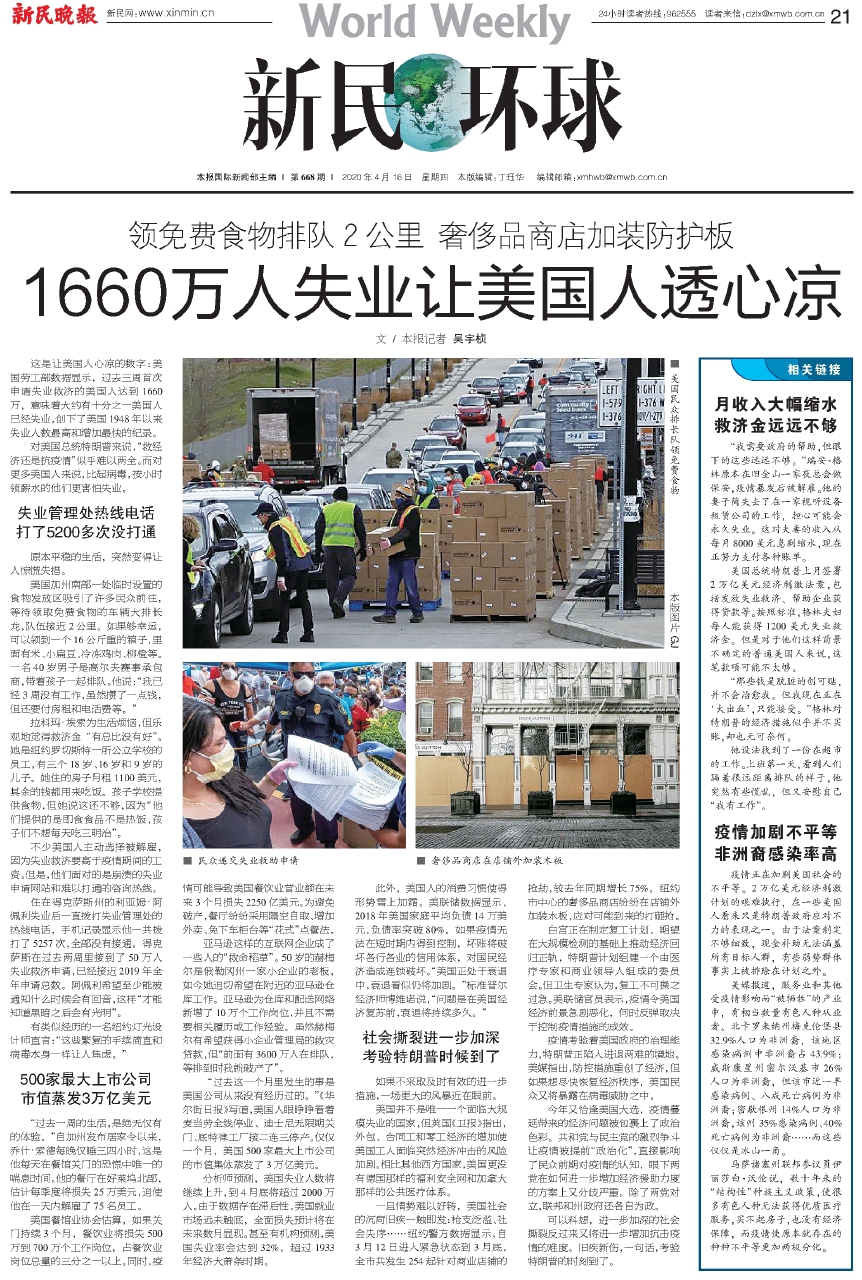 这是让美国人心凉的数字:美国劳工部数据显示,过去三周首次申请失业救济的美国人达到1660万,意味着大约有十分之一美国人已经失业,创下了美国1948年以来失业人数最高和增加最快的纪录。