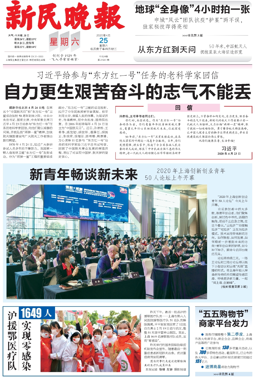 50年前,“东方红一号”卫星发射成功,我在陕北梁家河听到这一消息十分激动。当年,你们发愤图强、埋头苦干,创造了令全国各族人民自豪的非凡成就,彰显了中华民族自强不息的伟大精神。老一代航天人的功勋已经牢牢铭刻在新中国史册上。不管条件如何变化,自力更生、艰苦奋斗的志气不能丢。新时代的航天工作者要以老一代航天人为榜样,大力弘扬“两弹一星”精神,敢于战胜一切艰难险阻,勇于攀登航天科技高峰,让中国人探索太空的脚步迈得更稳更远,早日实现建设航天强国的伟大梦想。