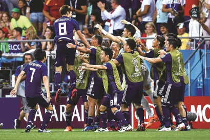 日本队在俄罗斯世界杯八分之一决赛上欢呼进球 图IC