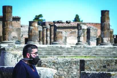 一名游客在重新开放的意大利庞贝古城遗址游览
