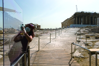 希腊雅典卫城恢复开放,工作人员清洁玻璃隔断 新华社发