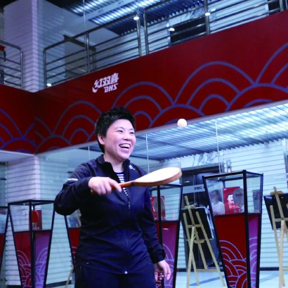 这一次在红双喜,楼世和又拿出了公司的“珍藏”——一副上世纪初的羊皮乒乓球拍,让邓亚萍试打。别看造型材质和现代的球拍不同,但邓亚萍使用起来相当娴熟,很快就上手了。