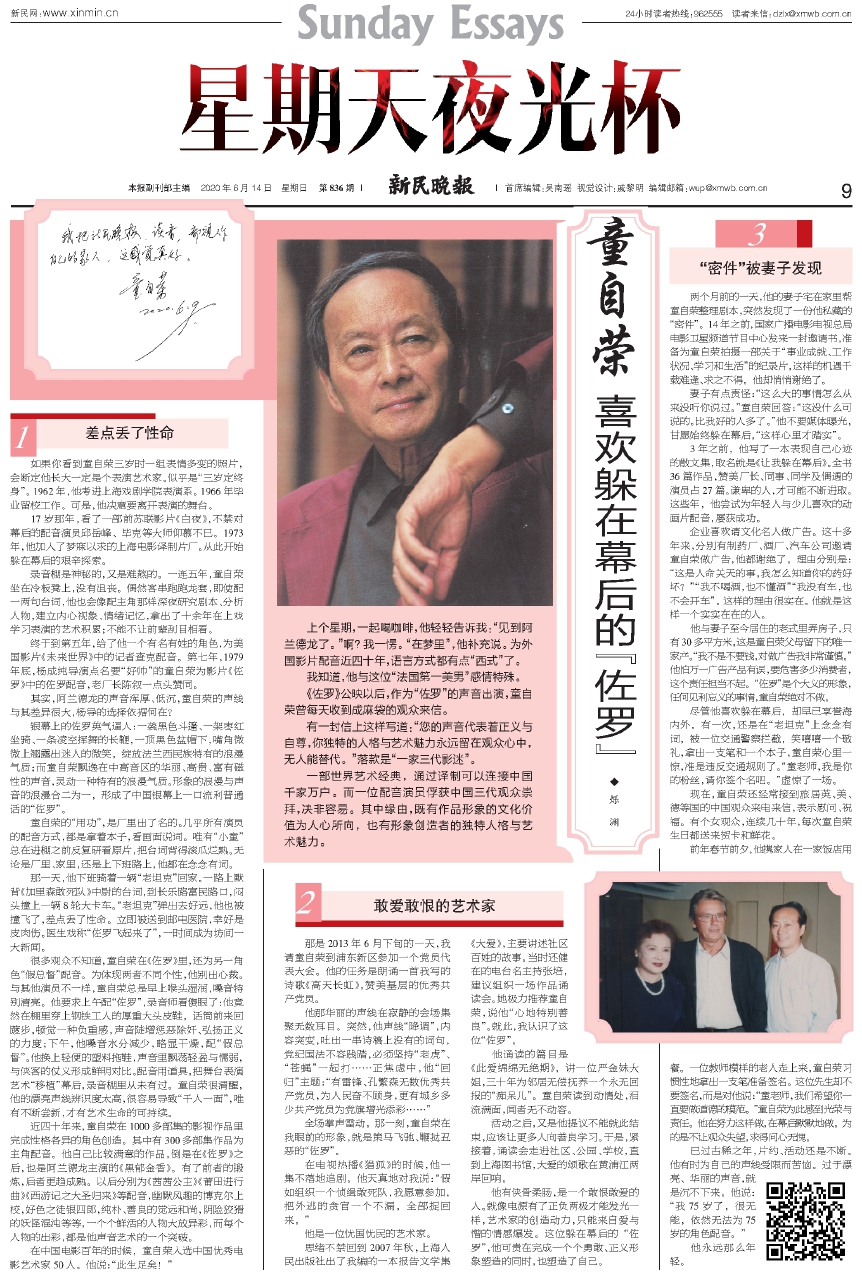 思绪不禁回到2007年秋,上海人民出版社出了我编的一本报告文学集《大爱》,主要讲述社区百姓的故事。当时还健在的电台名主持张培,建议组织一场作品诵读会。她极力推荐童自荣,说他“心地特别善良”。就此,我认识了这位“佐罗”。