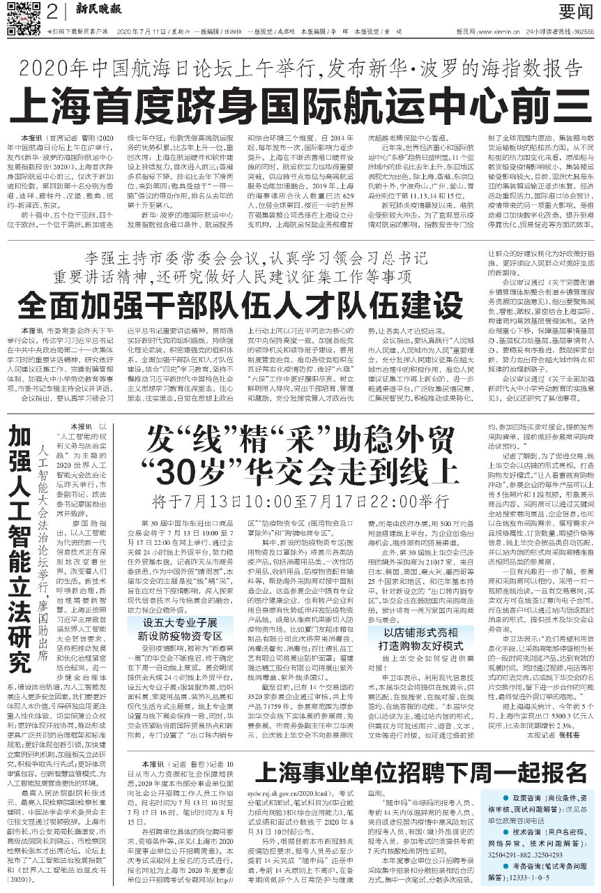 本报讯 (首席记者 曹刚)2020年中国航海日论坛上午在沪举行,发布《新华·波罗的海国际航运中心发展指数报告(2020)》,上海首次跻身国际航运中心前三,仅次于新加坡和伦敦,第四到第十名分别为香港、迪拜、鹿特丹、汉堡、雅典、纽约-新泽西、东京。