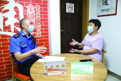 ◆潍坊街道城管执法中队队员陈鸣豪在城管社区工作室里接待张阿婆
