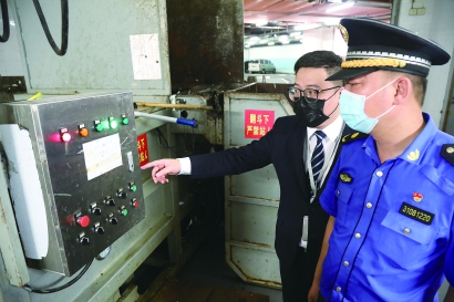 走进世纪汇广场,大厅里的醒目位置,就排列着垃圾分类的宣传展板。商场经理商中华坦言,经过城管队员的主动告知与执法、检查,他们对垃圾分类的意义和做法有了更深切的体会。每天,干垃圾压缩机按时工作,湿垃圾箱房则严格密闭,严控气味。即便在商场的垃圾箱房里,也闻不到明显异味。执法队员现场打开垃圾桶查看,分类有序,无错投乱放。
