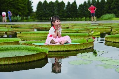 昨天,辰山植物园里王莲盛开,一场“百变萌宝坐王莲”的活动在这里举行。王莲,俗称大王莲,具有世界上水生植物中最大的叶片,因拥有巨型奇特的叶片而闻名于世。辰山植物园目前引种栽培的王莲主要是克鲁兹王莲,叶片圆形,直径可长达3米。 本报记者 周馨 摄