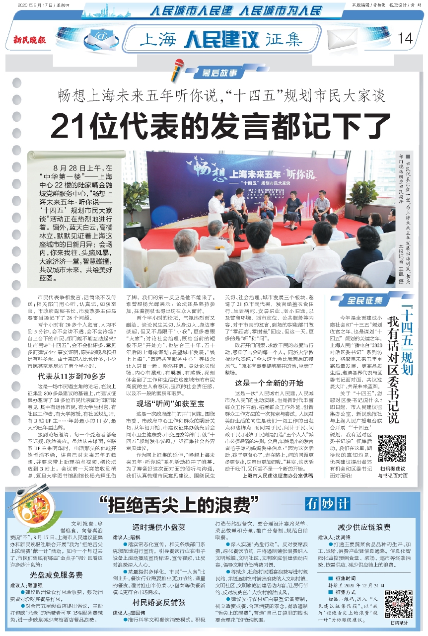 两个小时有20多个人发言,人均不到5分钟,会不会讲不透,会不会冷场?台上台下的市民、部门能不能互动起来?让市民讲“十四五”,会不会批评多、意见多而建议少?事实证明,原先的顾虑和担忧有些多余。由于来的人比预计多,不少市民甚至足足站了两个半小时。