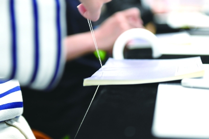 由上海图书馆历史文献中心文献保护修复部的修复师们从“古籍修复”和“碑刻传拓及拓片装裱”两项技艺所涉及的几十道工序中挑选出极具代表性且相对容易操作的步骤构成了本次的体验课程。比如,“碑刻传拓及拓片装裱”技艺中的“上纸”“上墨”与“揭纸”环节以及“古籍修复”技艺中的“补洞”与“穿线”环节。若不是深入体验,恐怕难以真正理解碑拓的制作细节,“上墨”动作的要领是双手需配合完成“斜下直落”,说起来简单,但真正落到纸上的动作要轻重适宜,轻了上墨太少,重了又容易把纸弄破,对手上的“功夫”要求不低。在“揭纸”环节,需轻轻挑起封口,以斜45度角慢慢揭起,此刻,屏息,能听到纸张微微的簌簌声。