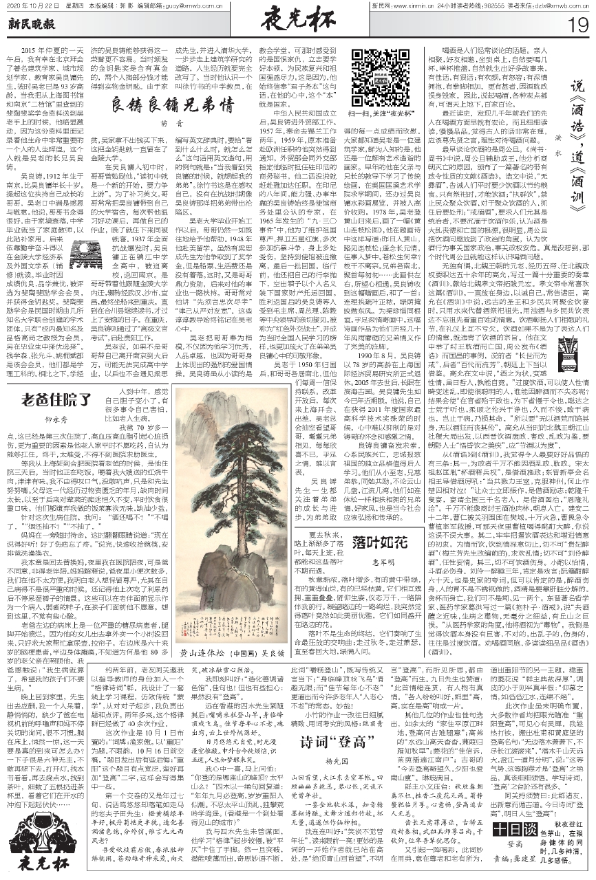 吴老大学毕业开始工作以后,哥哥仍然一如既往地给予他帮助。1948年他赴美留学,虽然有梁思成先生为他争取到了奖学金,但是船票、生活费还是没有着落。这时,又是哥哥鼎力资助,后来对他的事业也一路扶持。哥哥常对他讲“先须言忠次尽孝”“律己从严对友宽”,这些谆谆教导始终铭记在吴老心中。