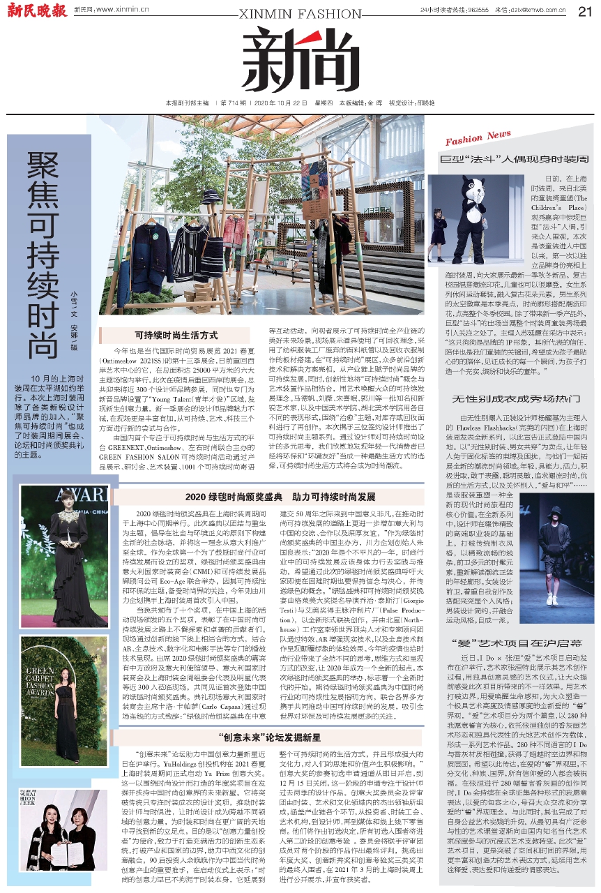由国内首个专注于可持续时尚与生活方式的平台GREENEXT、Ontimeshow、左右时尚联合主办的GREEN FASHION SALON可持续时尚活动通过产品展示、研讨会、艺术装置、1001个可持续时尚寄语等互动活动,向观者展示了可持续时尚全产业链的美好未来场景。现场展示道具使用了可回收理念,采用了纺织服装工厂废弃的面料纸管以及回收衣服制作的板材搭建。在“可持续时尚”展区,众多前沿创新技术和解决方案亮相,从产业链上赋予时尚品牌的可持续发展。同时,创新性地将“可持续时尚”概念与艺术装置作品相结合,用艺术唤醒大众的可持续发展理念。马德帆、刘薇、宋喜岷、郭川等一批知名和新锐艺术家,以及中国美术学院、湖北美术学院用各自不同的表现形式,围绕“治愈”主题,对库存或回收面料进行了再创作。本次携手三位签约设计师推出了可持续时尚主题系列。通过设计师对可持续时尚设计的多元思考,我们欣慰地发现年轻一代消费者已经将环保和“环境友好”当成一种最酷生活方式的选择,可持续时尚生活方式将会成为时尚潮流。