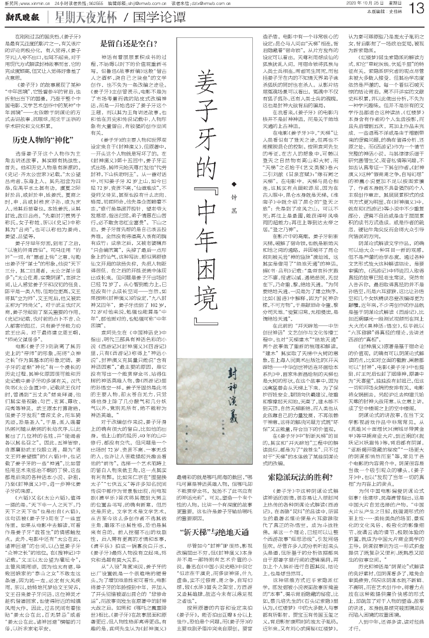 在刚刚过去的国庆档,《姜子牙》是最有关注度的影片之一。有关该片的评论两极分化,有人觉得,《姜子牙》让人夸不出口,也骂不起来,对于用现代方式解读封神故事而言,它的完成度颇高,但又让人觉得好像差了点意思。