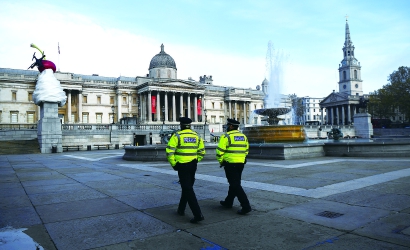 伦敦警察在空荡荡的特拉法尔加广场巡逻