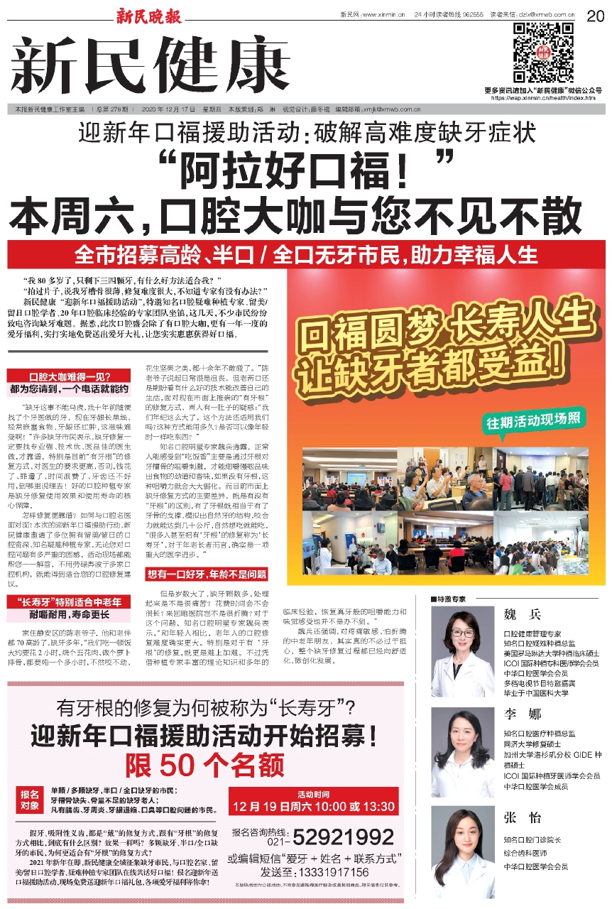2021年新年在即,新民健康全城征集缺牙市民,与口腔名家、留美/留日口腔学者、疑难种植专家团队在线共话好口福!报名迎新年送口福援助活动,现场免费送迎新年口福礼包,各项爱牙福利等你拿!