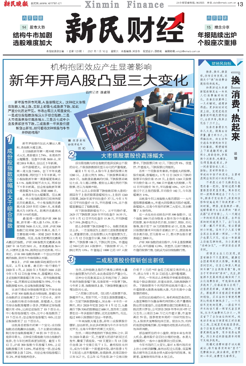 这就是目前股市的第一个变化:成份股指数远远跑赢综合指数。几个主要成份股指数比综合指数涨幅高了10到20个百分点,差异非常大。这种成份股指数与综合指数的差异,在今年初表现得更加明显。截至1月12日,沪深300指数今年涨幅7.39%,上证指数涨幅只有3.89%,两者相差一倍;创业板指数同期上涨7.22%,而创业板综指涨幅只有2%,两者相差两倍多。